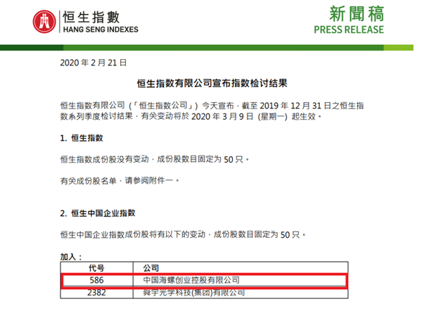 2020年2月21日,恒生指數有限公司宣布截至2019年12月31日之恒生指數系列季度檢討結果,將中國海螺創業控股有限公司和舜宇光學科技加入恒生中國企業指數,將中國人民保險集團和中國中車剔除恒生中國企業指數。恒生指數成分股沒有變動,成分股數目固定為50只。