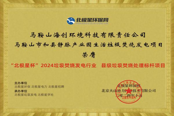 馬鞍山海創榮膺“北極星杯”2024垃圾焚燒發電行業 縣級垃圾焚燒處理標桿項目