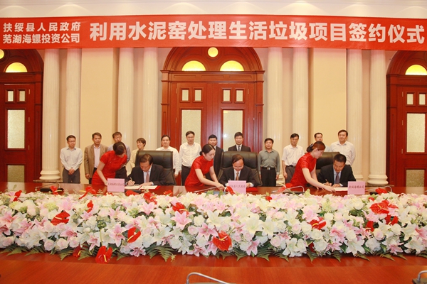 ? ? 2014年10月23日上午,扶綏縣人民政府、海螺創業公司、扶綏海螺水泥公司在蕪湖海螺國際會議中心正式簽署了《扶綏縣利用水泥窯處理生活垃圾項目合作協議》,扶綏縣縣委書記藍大煌,縣委常委、副縣長許家愷;海螺創業總經理紀勤應、戰略企劃部部長卜華松;扶綏海螺水泥公司總經理萬長寶等參加了簽約儀式。許家愷、紀勤應、萬長寶分別代表扶綏縣政府、蕪湖海螺投資公司及扶綏海螺在合作協議上簽字。